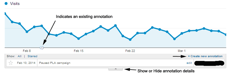 The process with these key metrics is simple in concept, measure the current metric, make a change and then measure the result. Did your action increase or decrease the metric? Then repeat over and over. A tip that will help immensely in virtually all analytics analysis (say that ten times fast) is the use of the annotation function. See screen shot.