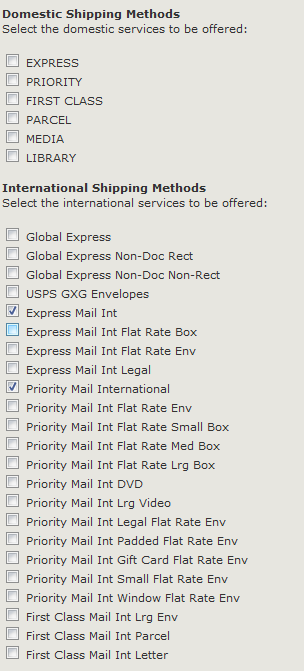 Other settings that are separate for domestic and international are the shipping methods you want to offer. Some methods, like Priority Mail, are available for both but some methods are specific to domestic and some specific to international. In the module, the checked options are the ones that will be available to your shoppers.